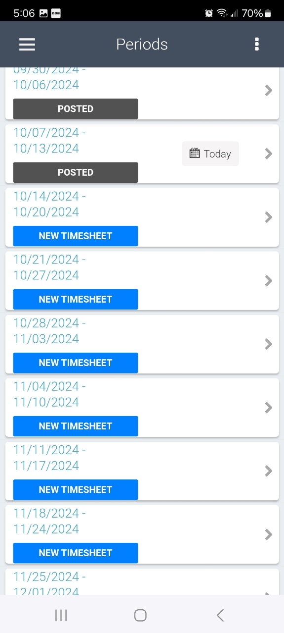 Congratulations! Upon successful entry of your pin or biometric login, you will be directed to the timesheet period selection screen, which is the default option.