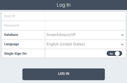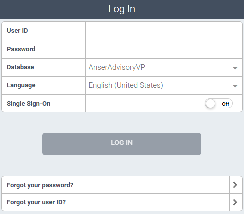 Database: Should be “AnserAdvisoryVP.” If not, then click on the dropdown arrow and select “AnserAdvisoryVP.” Do not select any option with a description of “Sandbox.”